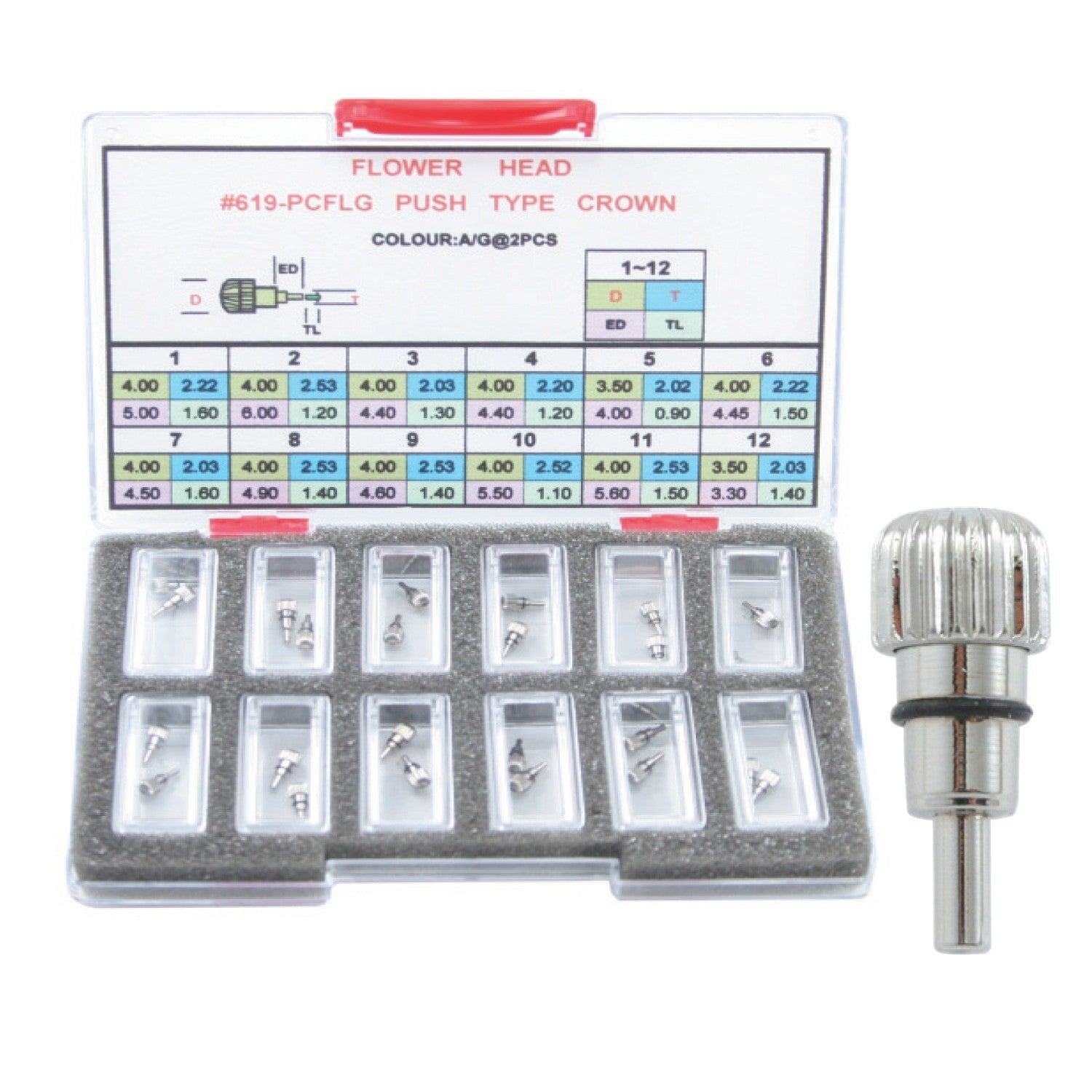 Assortment contains 2 each in 12 different sizes all white. Total of 24 push buttons.