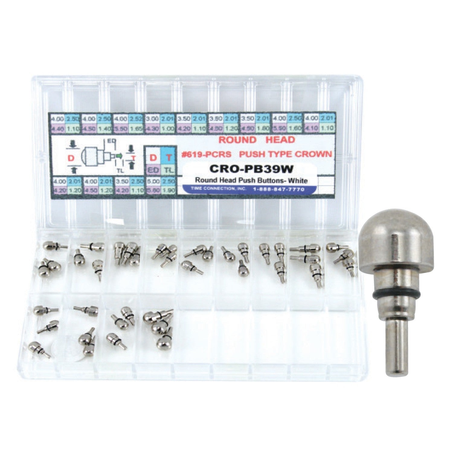 Assortment contains 3 each in 13 different sizes all white. Total of 39 push buttons.
