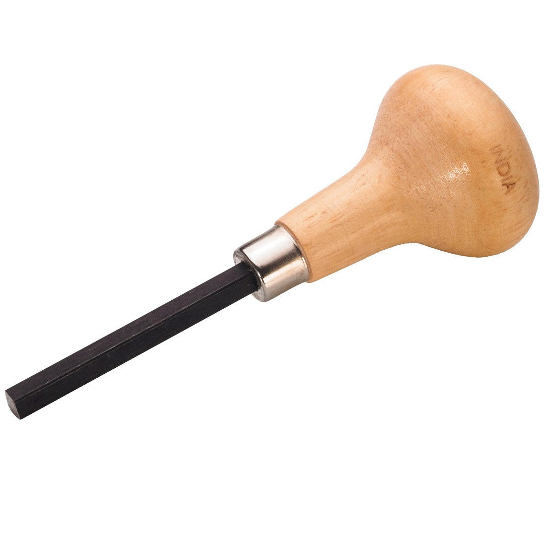 Handy tool for pushing prongs or crown points around stones. Steel tool mounted in wood handle.