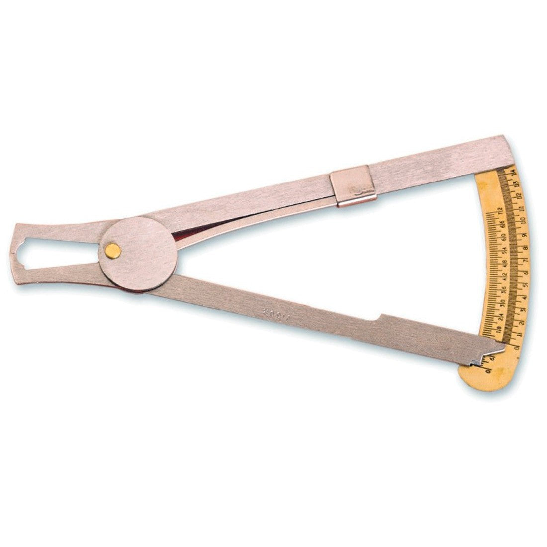 Made of stainless steel with spring action, this gauge features a brass measuring the outside dimensions of any object, adjustable point for close tolerance work. 3/4 (19.1 mm) jaw. Graduations in 1/12 lignes and 1/10 mm.
