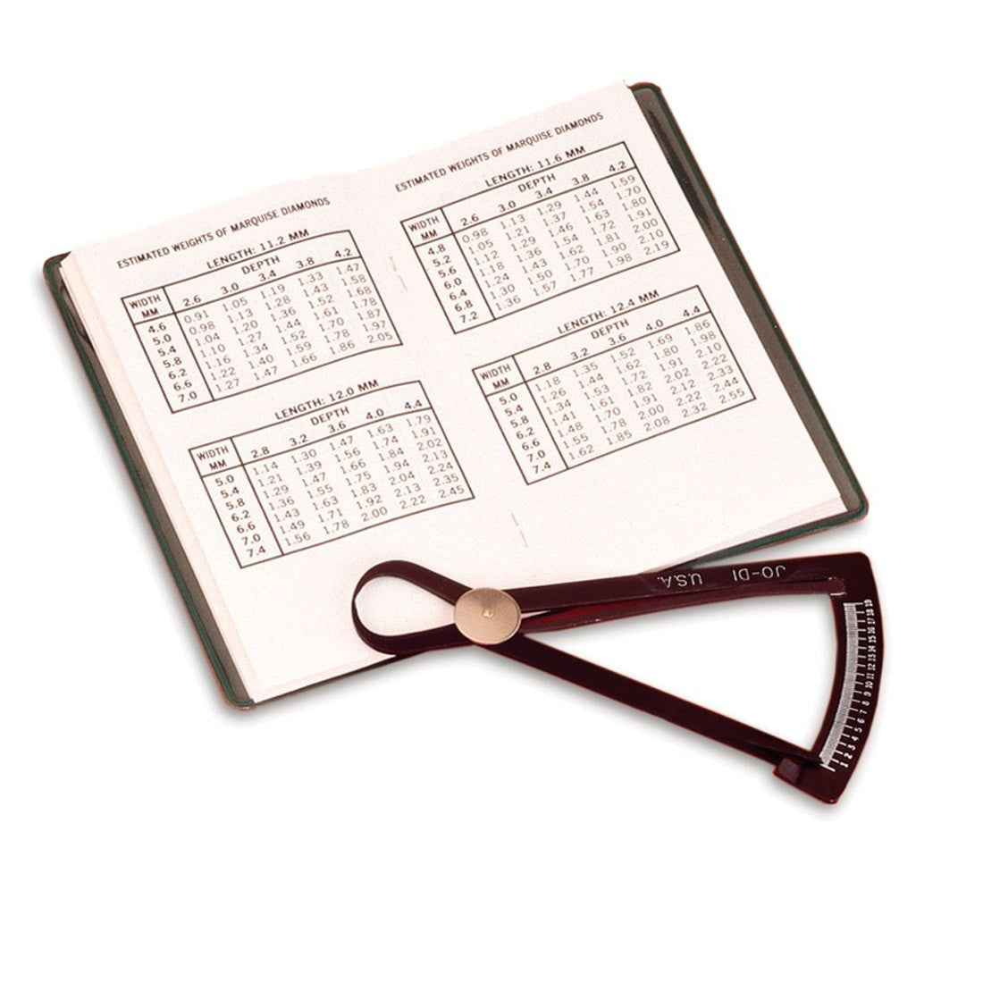Allows you to estimate the weight of all popular shapes of diamonds without removing the stone from the mounting. Width and depth are measured with caliper and compared with measurements in table. For round and fancy shapes.