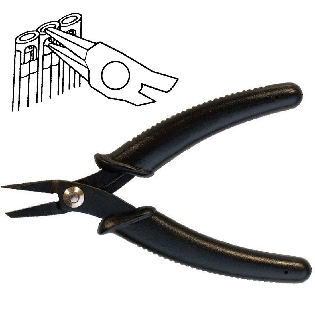 The flat jaw rests atop the link, and the pointed tip fits under the clip spring. By gently squeezing, the clip spring pops up and can be easily removed to allow for sizing.