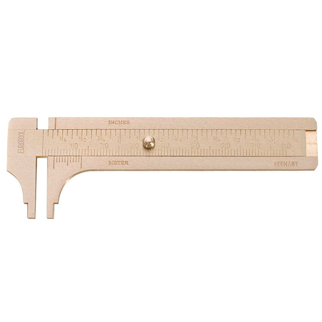 This German made gauge in solid brass offers a combination of inches and millimeters. It features notched jaws for inside / outside measurements and a 1/10th millimeter vernier for accuracy.