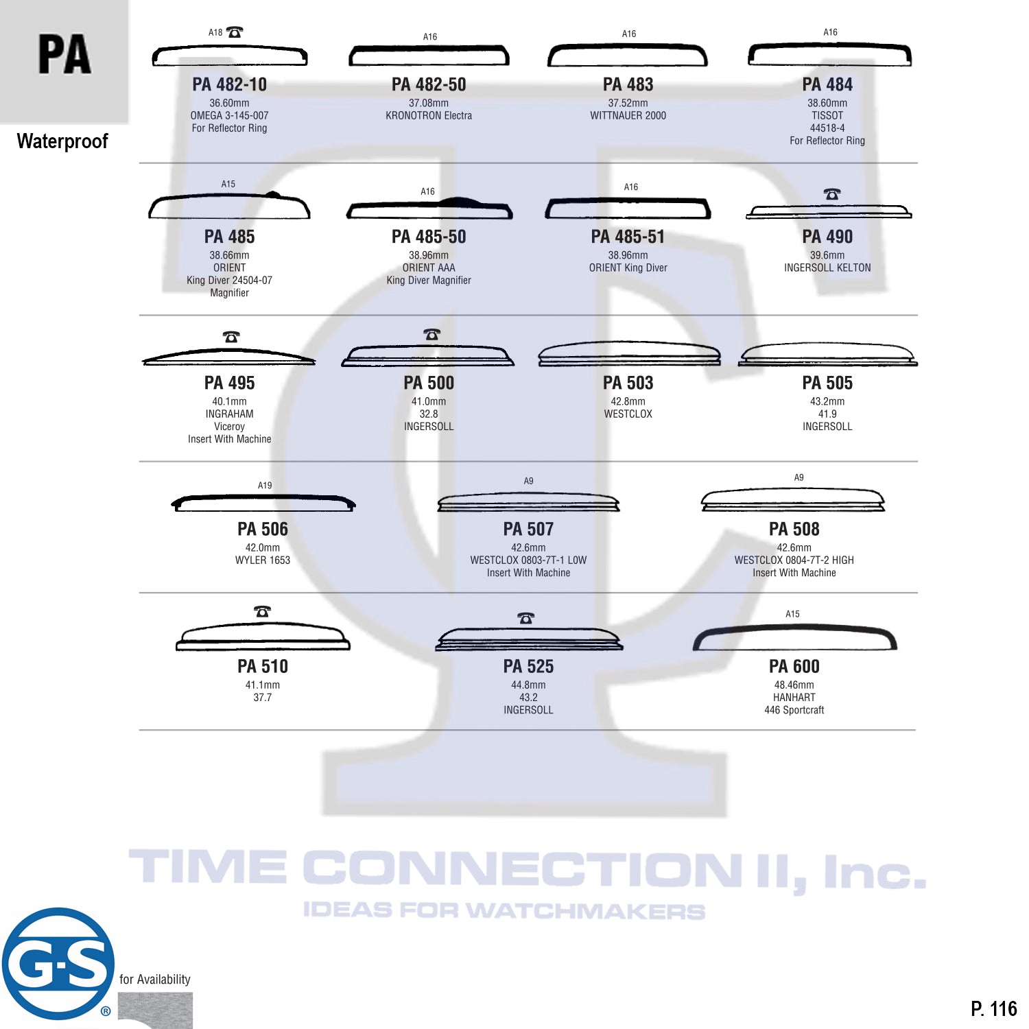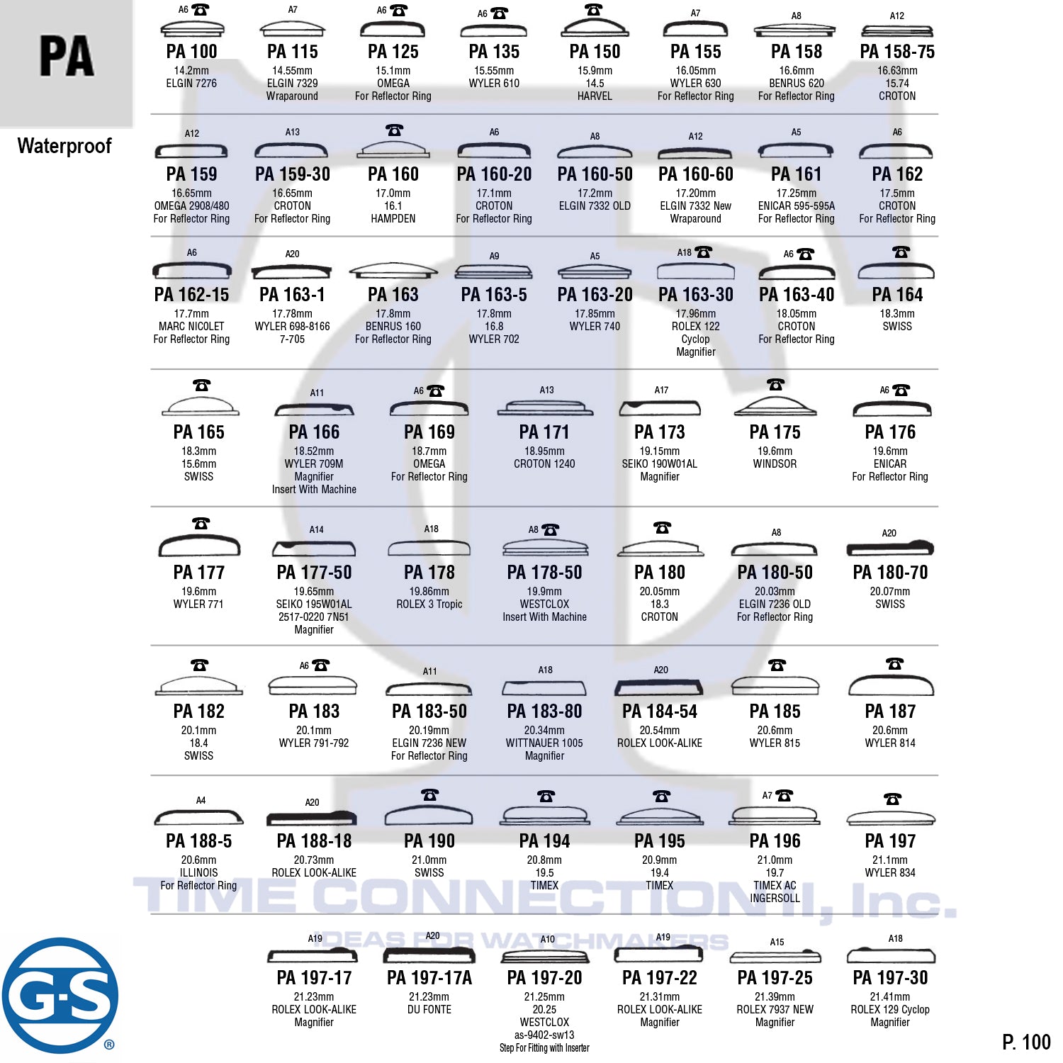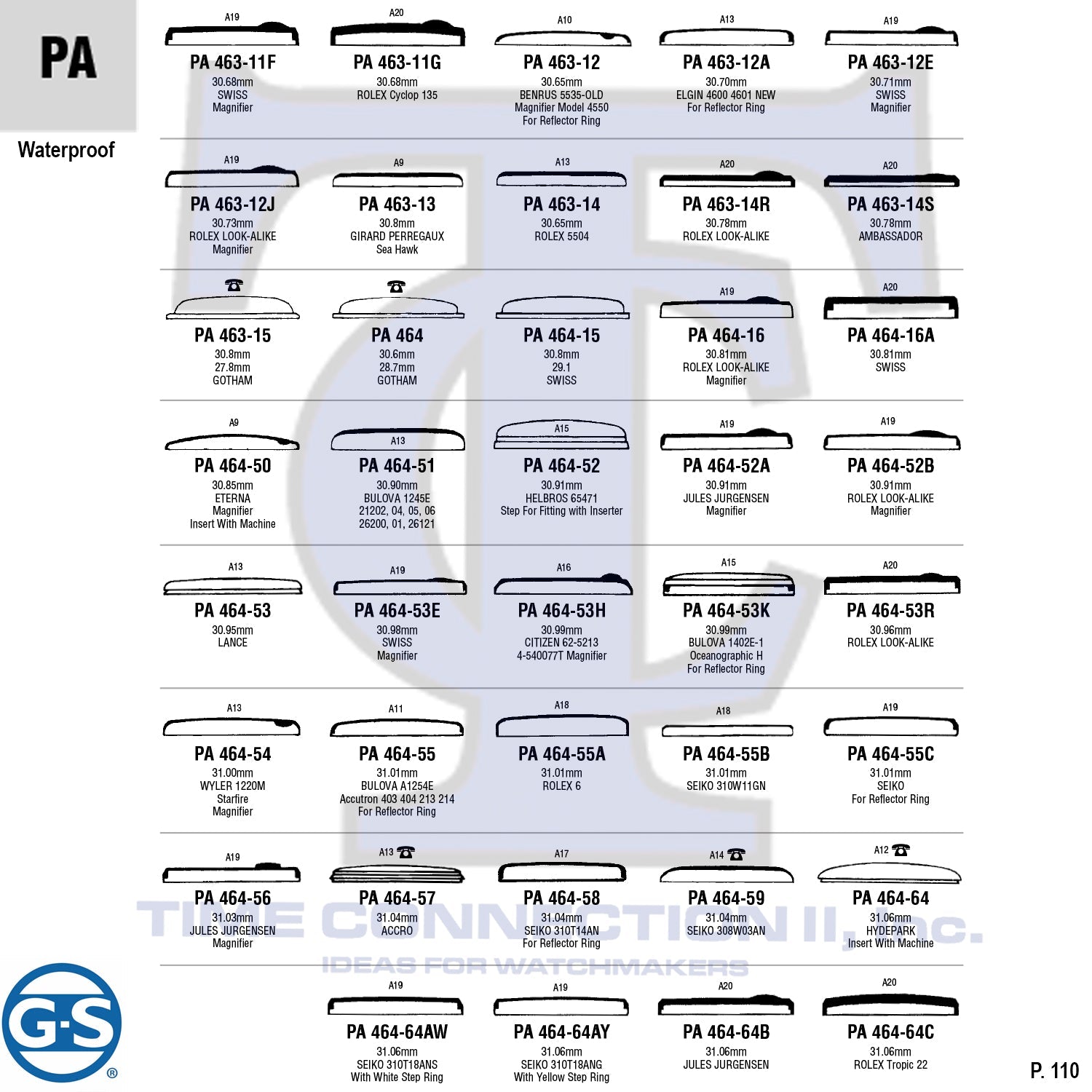 This collection features a complete line of GS PA WATERPROOF PLASTIC CRYSTALS, presented in alphanumerical order. It is a valuable and essential tool for watchmakers and hobbyists, allowing for accurate selection of the perfect watch crystal. G-S crystals are also widely used by manufacturing jewelers for unique jewelry designs such as lockets, pendants, and mountings. Each crystal is displayed with an overhead view and a cross-sectional view to showcase its dimensions, along with other identifying information. Don't miss out on this excellent resource and place your next order online with us today!