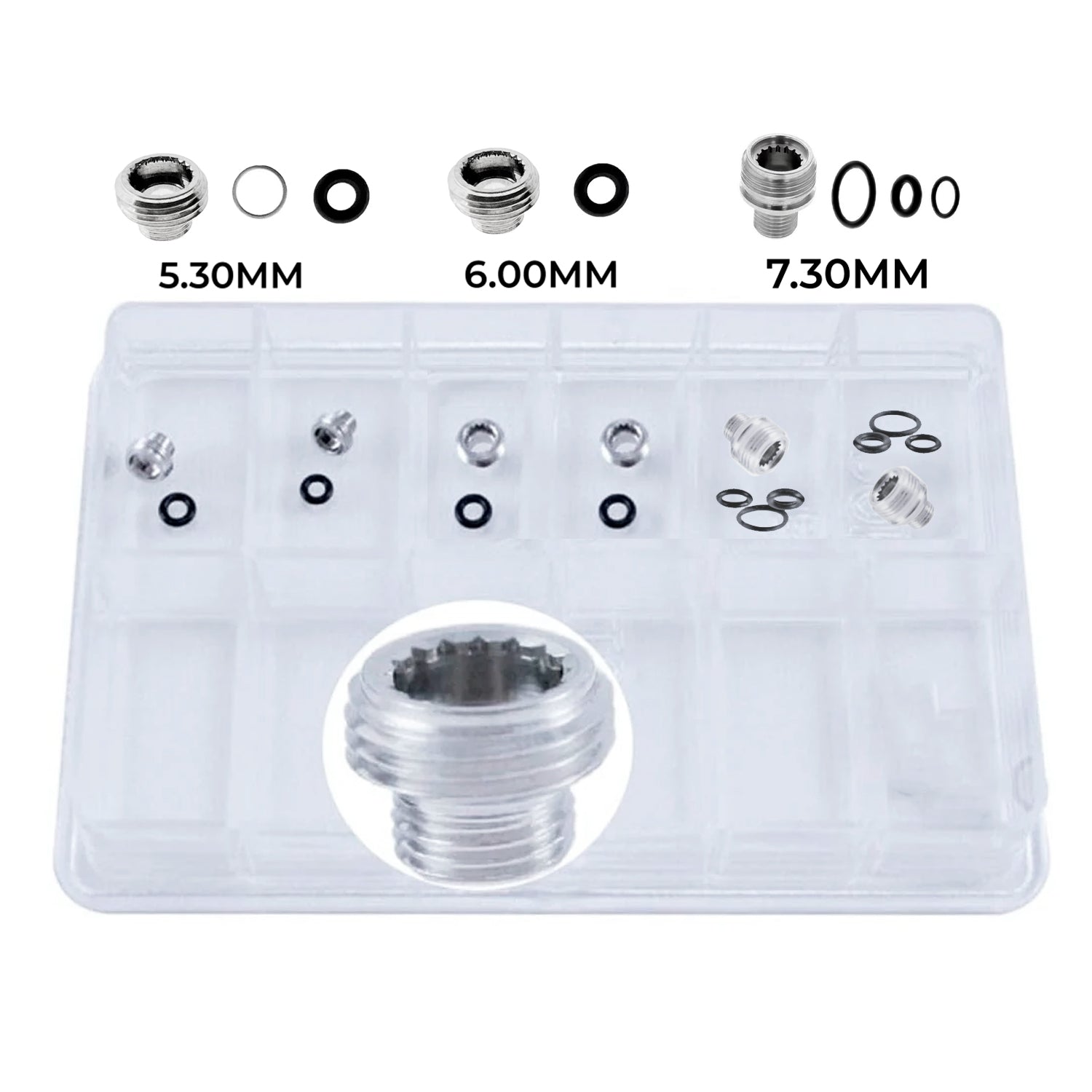 Assortment contains 2 sets of case tubes 5.30mm, 6.00mm and 7.30mm along with tube gaskets. A perfect starter set for anyone repairing Rolex watches.