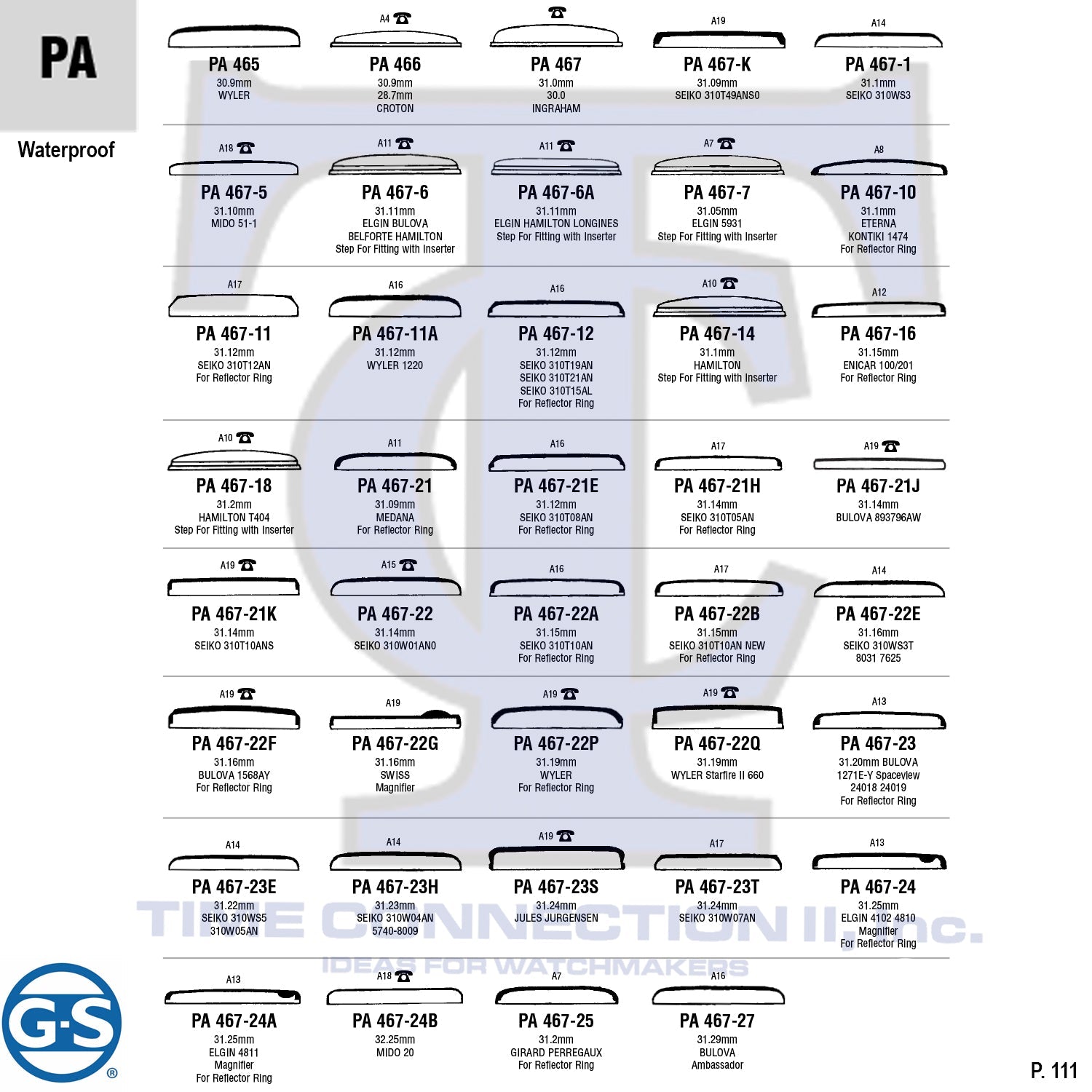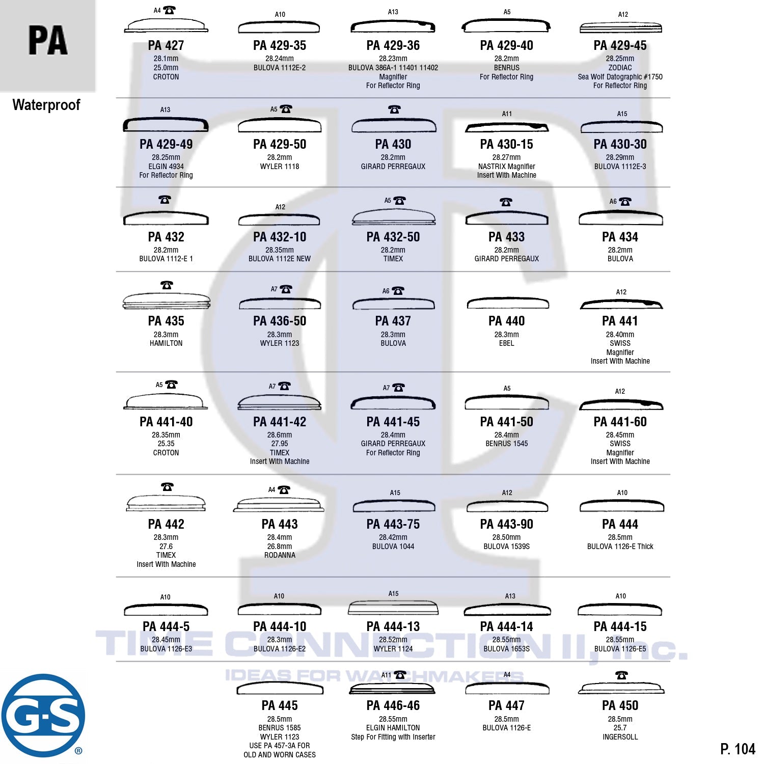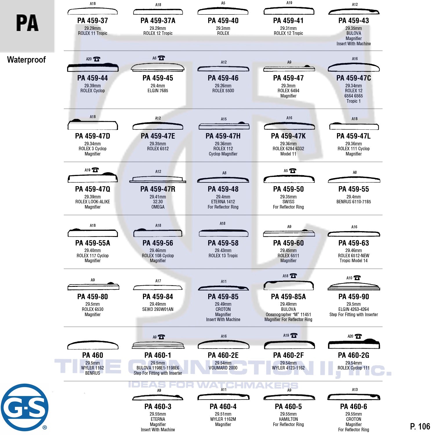 This collection features a complete line of GS PA WATERPROOF PLASTIC CRYSTALS, presented in alphanumerical order. It is a valuable and essential tool for watchmakers and hobbyists, allowing for accurate selection of the perfect watch crystal. G-S crystals are also widely used by manufacturing jewelers for unique jewelry designs such as lockets, pendants, and mountings. Each crystal is displayed with an overhead view and a cross-sectional view to showcase its dimensions, along with other identifying information. Don't miss out on this excellent resource and place your next order online with us today!