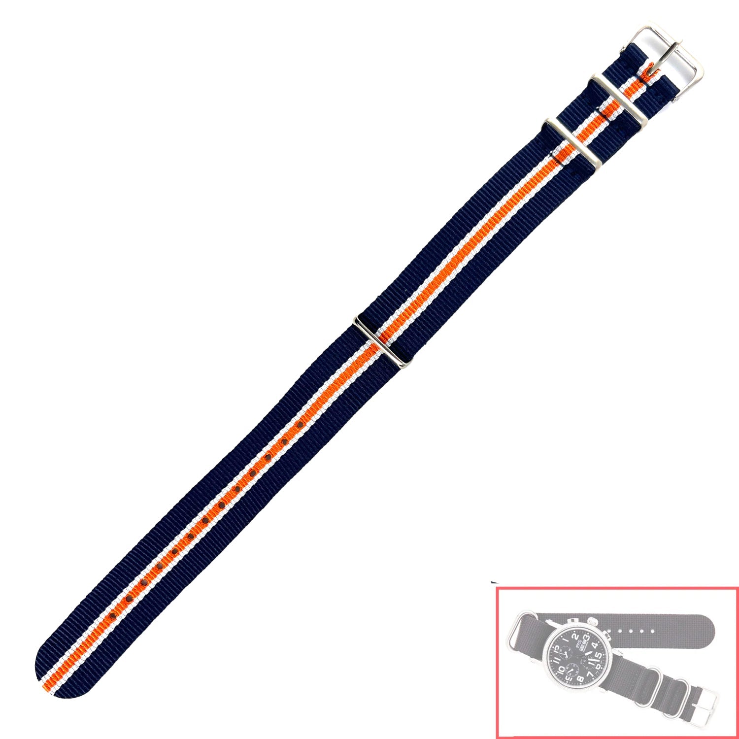 Nato Style Straps No. 510 are an elegant and beautiful color sturdy nylon band. A style that matches well with every timepiece. Made up of just one nylon strip, so it won't fall apart since it is not multiple layers. Great steel buckle, shiny finish.