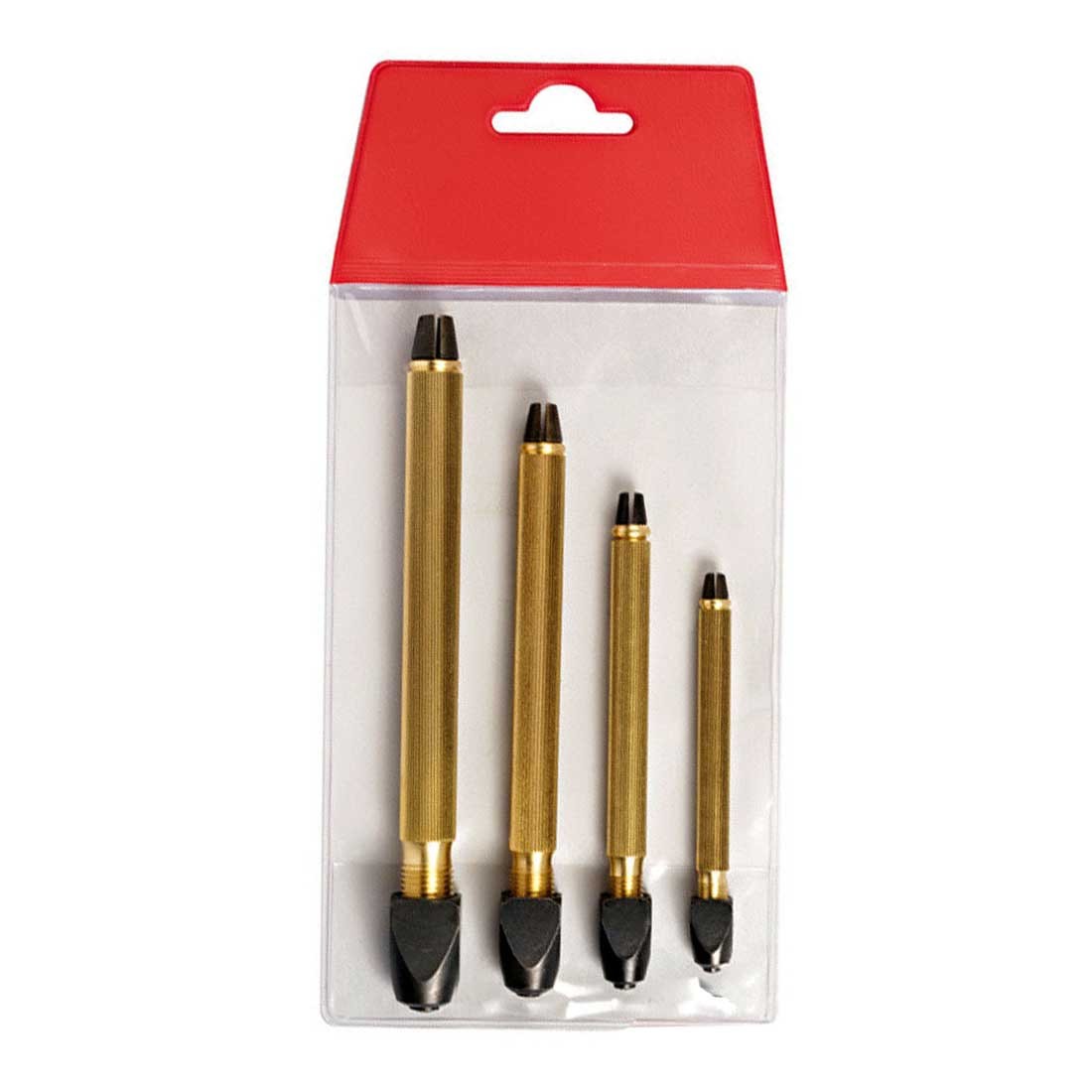 This is a set of the 4 most popular pin vices, Swiss made by Horotec. Each pin vice has a fluted, hollow brass handle and a square head to prevent them from rolling on your bench. Each pin vice comes with 2 collects and the set is neatly packaged in a plastic wallet.