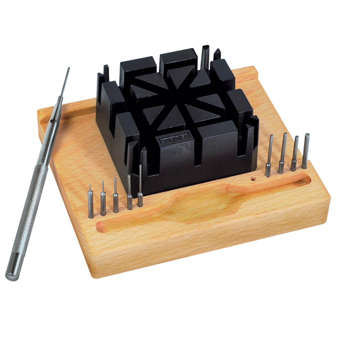 Bracelet pins remove set, includes 1 universal bracelet holder on a wooden base.