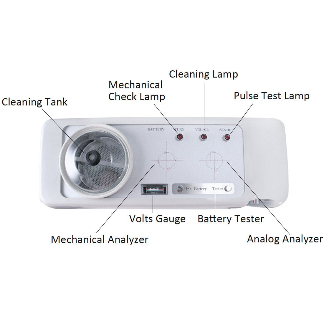 Feature allows you to find out, tests functioning of quartz crystal, performance of integrated circuit, and continuity of coil and battery voltage. Enables you to perform tests without removing case backs. Designed for quartz watches. Mechanical checking system of a movement by turning the hands (fast gear train rotation), Demagnetizing. Quartz movements cleaning system without disassemble the movements and cleans in 5 minutes. Quick diagnosis with no need for a quotation. No maintenance costs. Cost efficient. Time efficient. Simple to use. Reg. $995.00.