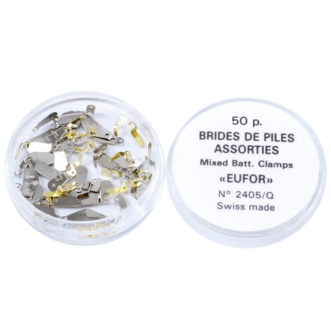 Assortment contains battery clamps for swiss movements. Total 50 clamps