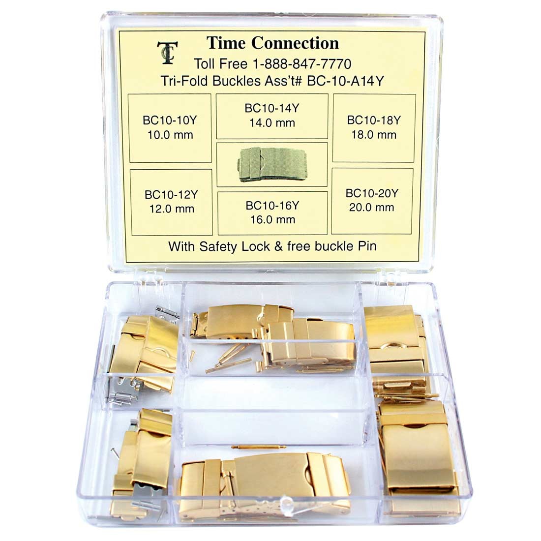 Assortment contains 2 each all buckles (10mm~22mm) in IPG gold plated buckles. Total of 14 buckles.