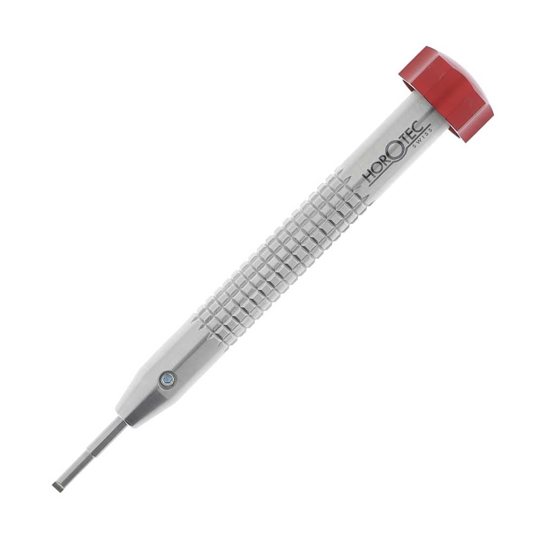 Horotec Swiss made large watchmaker screwdriver features a knurled 10mm diameter stainless steel handle with a 19 mm red anodized aluminum red head mounted on ball bearings. The blade used in this screwdriver has a 3 mm body and reduces down to 1.50 mm at the tip, so the blade can be interchanged with any one of the MSA 01.019 series blades.