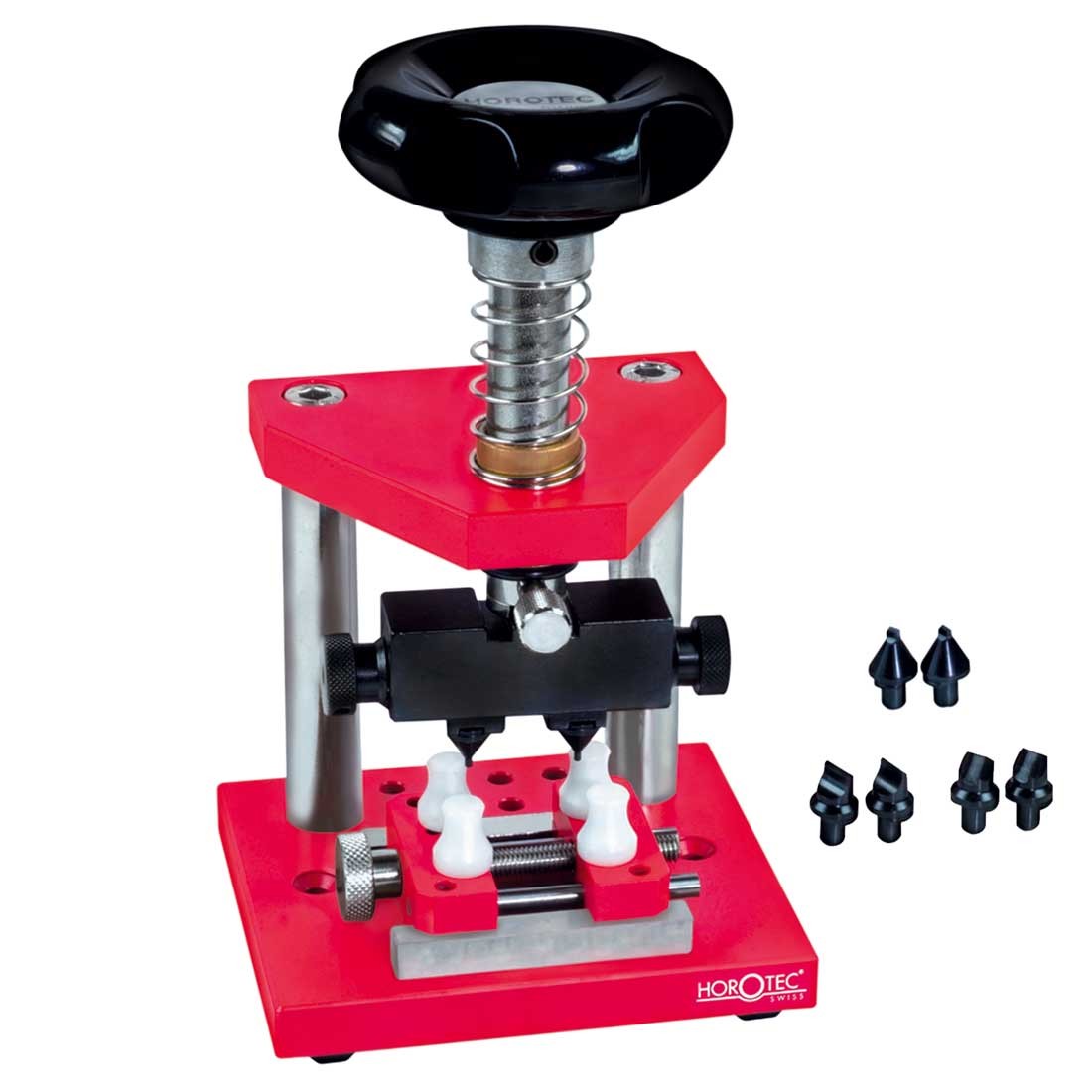 The powerful Horotec® MSA07.320 press is your key to precision. Crafted with steel and aluminium, it's robust yet compact - and delivers perfect visibility for frontal, lateral and plunging views. The adjustable watch holder and replaceable Delrin® dies keep cases securely and horizontally in place, enabling you to unscrew that case back with ease. Opens watch cases up to Ø65mm and a top wheel of Ø70mm. Ready to meet any challenge! Size 110mm x 95mm x 200mm