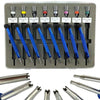 Precision-engineered screwdriver set specifically designed for Richard Mille timepiece servicing. This essential collection features eight specialized tools with interchangeable 4 & 5 prong spoke tips, engineered to match the exacting standards of luxury watch maintenance. Each screwdriver delivers the exact fit and control required for delicate case work and intricate adjustments. Includes spare tips to ensure you're always equipped for professional-grade repairs. An indispensable addition to any serious watchmaker's toolkit.