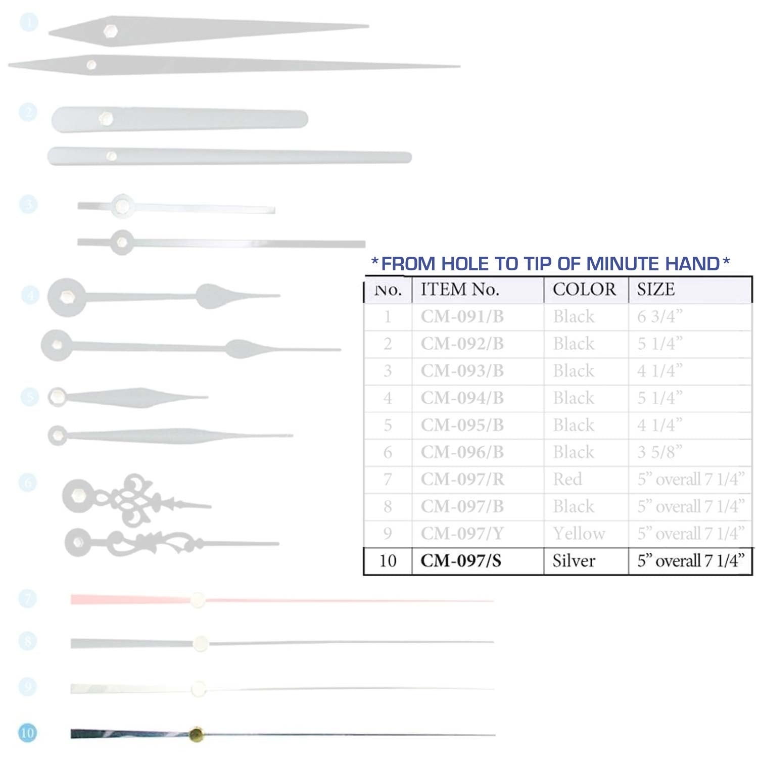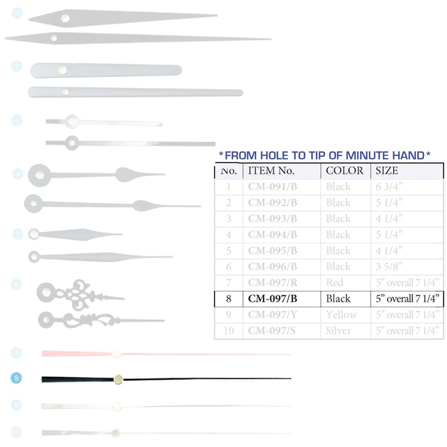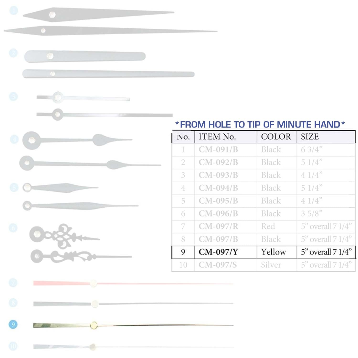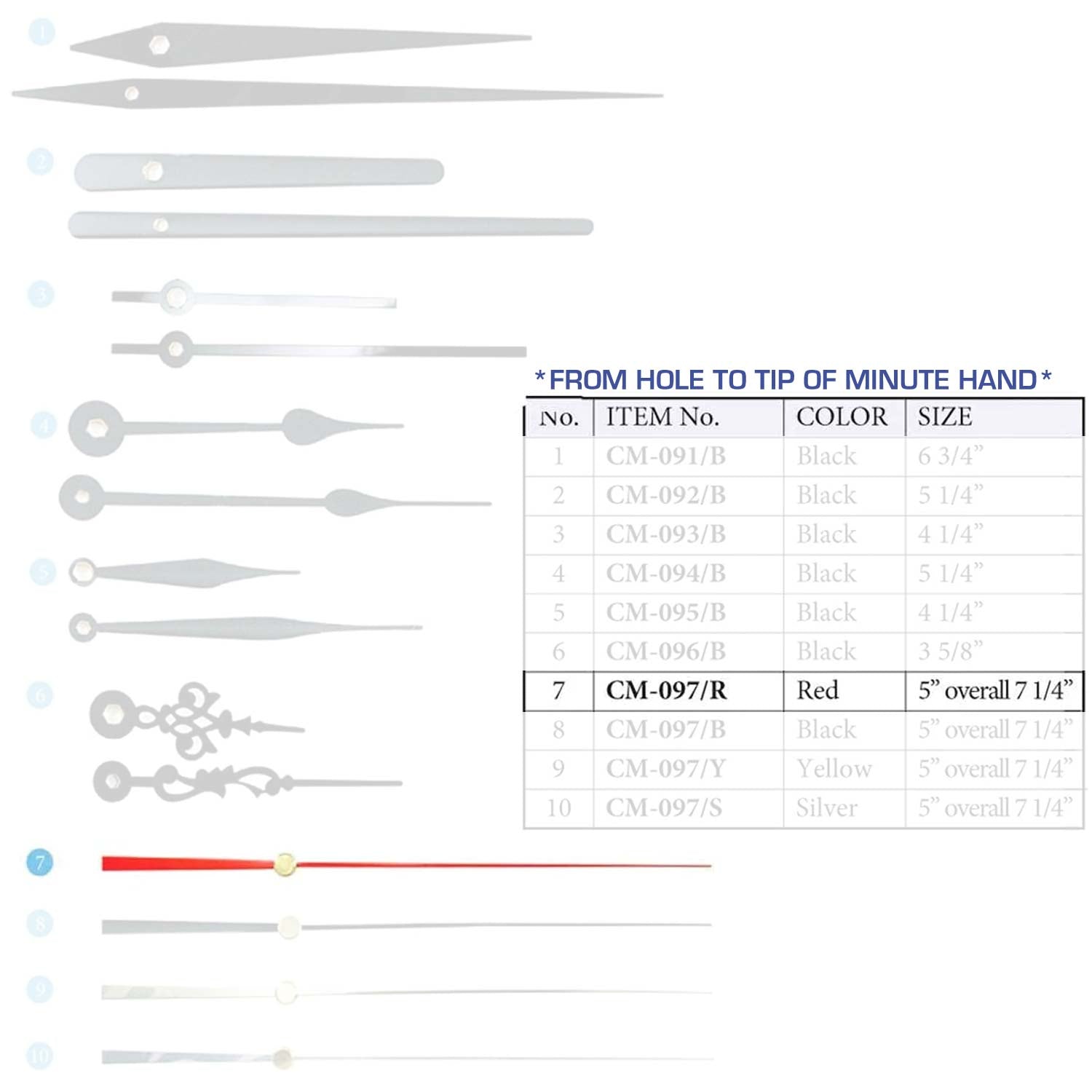 Size are measured from the hole to the tip of the minute hand