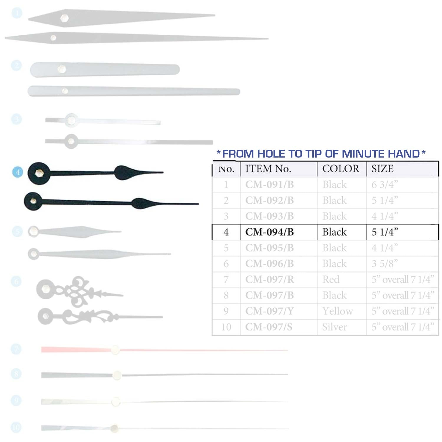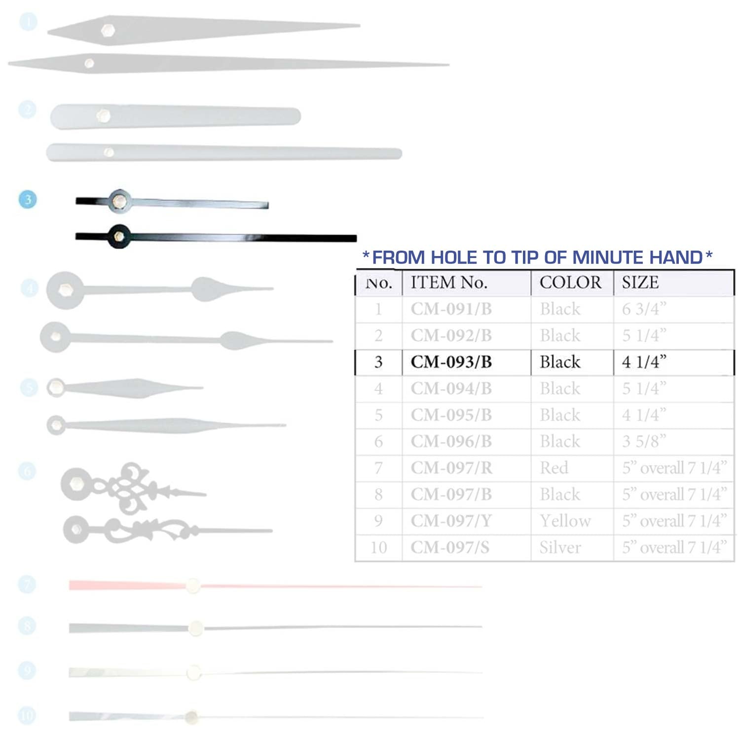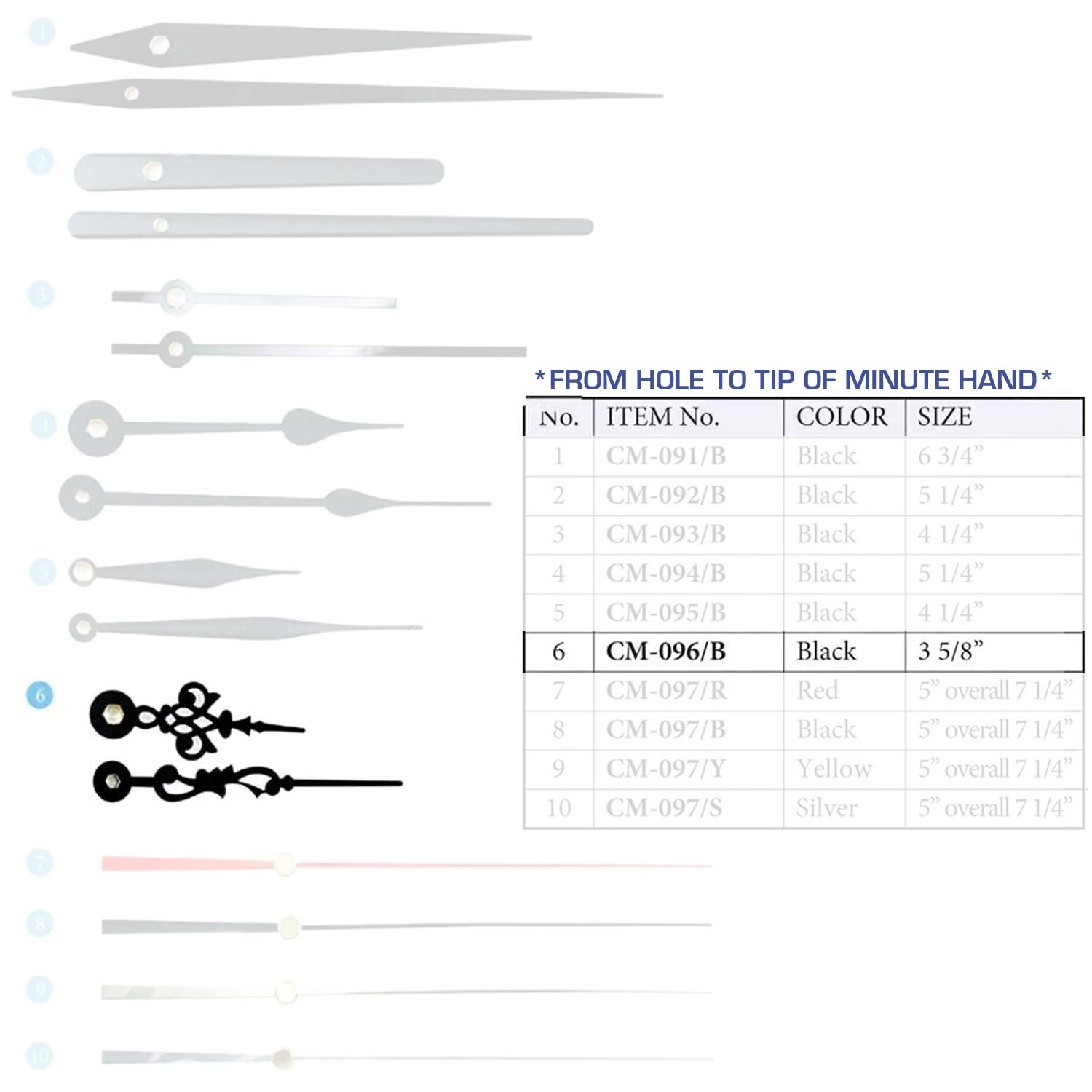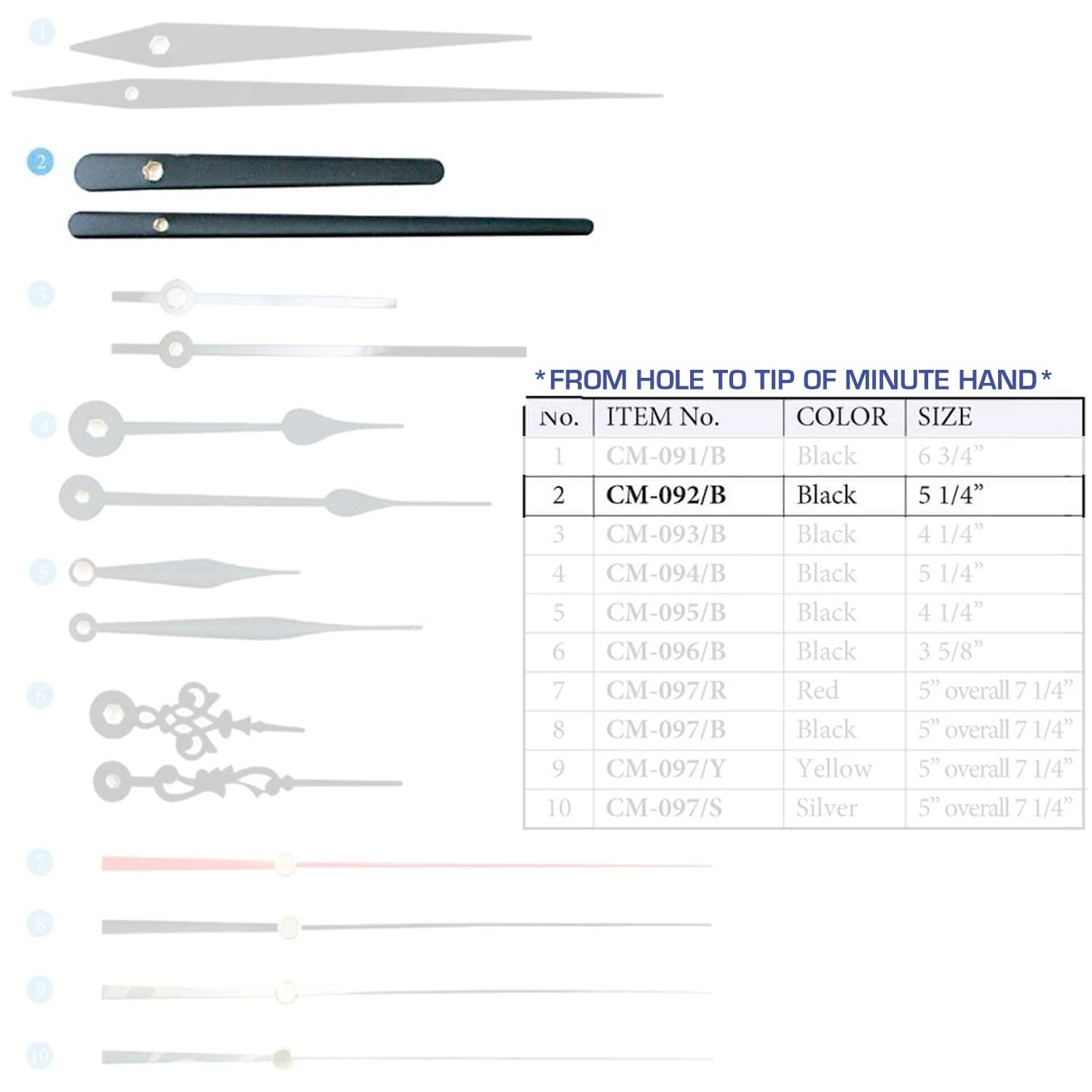 Size are measured from the hole to the tip of the minute hand